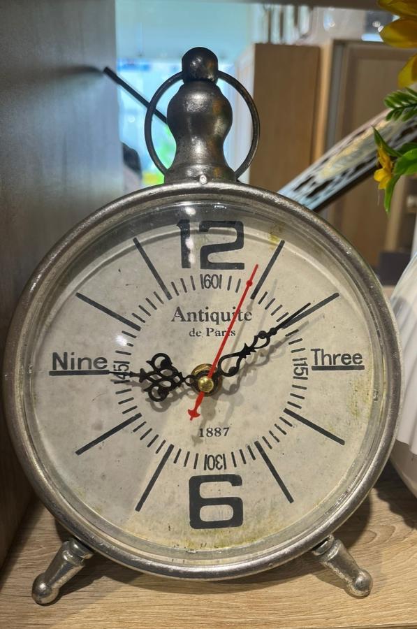 Réveil en métal argenté au style ancien avec un cadran inspiré des horloges européennes classiques. Son aspect légèrement vieilli lui donne un caractère authentique. Un excellent élément décoratif pour les amoureux du style rétro et des obj