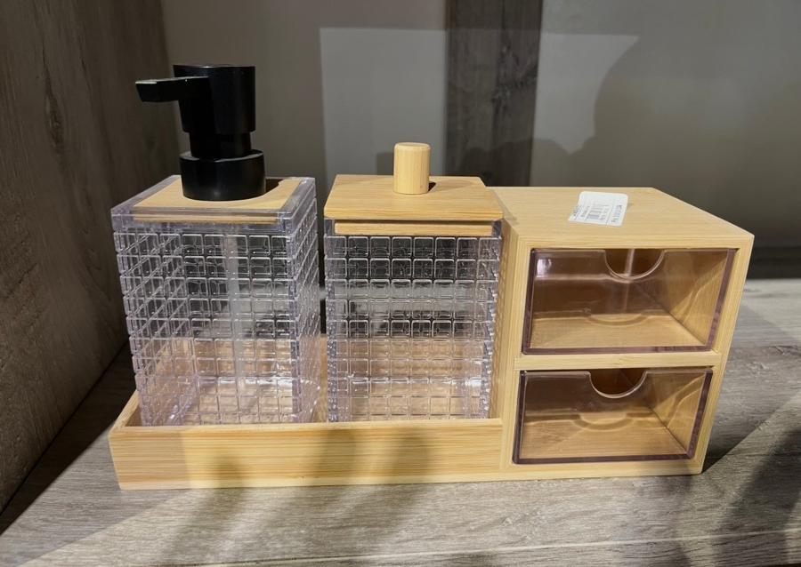 Ce set se distingue par son design en acrylique transparent avec des motifs carrés qui captent la lumière. Le plateau en bambou et les tiroirs intégrés offrent un rangement pratique et esthétique. Un ensemble parfait pour une salle de bain propre, organisée et mo
