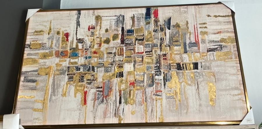 Ce tableau abstrait mêle formes géométriques et textures riches pour un rendu sophistiqué et contemporain. Les nuances dorées apportent une touche de luxe, idéale pour les intérieurs modernes et é