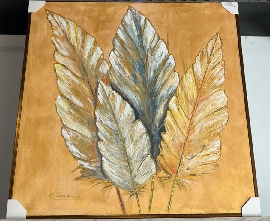 Ce tableau représente des feuilles généreuses peintes dans un style artistique texturé. Les couleurs chaudes et naturelles apportent une ambiance douce et harmonieuse à votre décoration. Une pièce idéale pour un salon, chambre ou espace