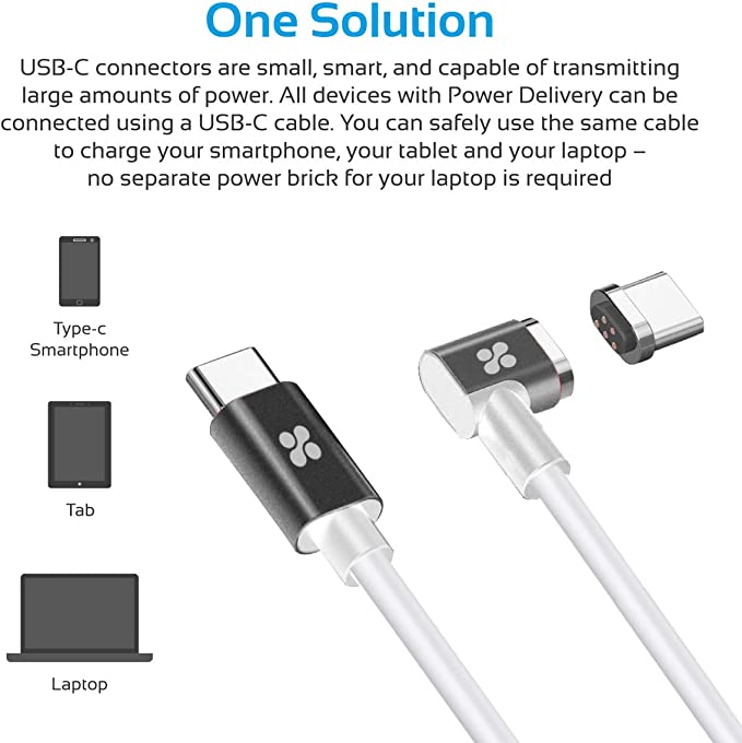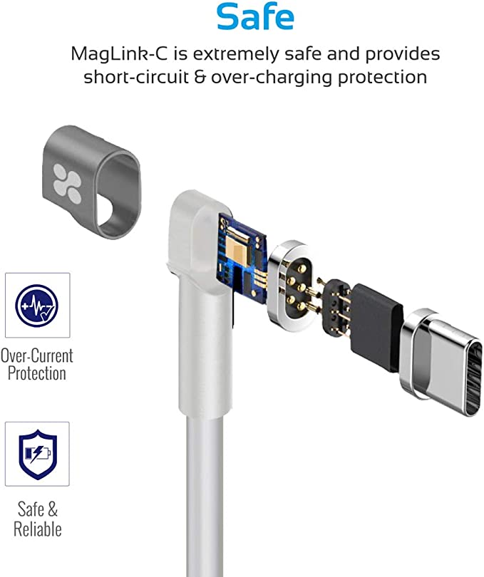 Câble de chargement magnétique USB-C vers USB-C avec alimentation électrique Plongez dans la nouvelle technologie avec MagLink-C. Découvrez la plate-forme de connectivité la plus évoluée avec MagLink-C en chargeant votre appareil à la vitesse de l'éclair avec ce câble magnétique de classe à part. MagLink-C peut fournir une puissance élevée allant jusqu'à 86 watts dans les deux sens. Compatibilité standard complète La configuration standard du MagLink-C facilite son utilisation au quotidien sans avoir à se soucier des problèmes de compatibilité ou d'utilisation sur toute la ligne. Le câble multi-usages avec charge rapide MagLink-C offre à la fois une fonctionnalité de synchronisation et de charge pour tous vos appareils, et il dispose de Power Delivery 3.0 pour une efficacité maximale. Conçu pour la convivialité et la longévité, MagLink-C utilise une conception de câble à angle droit qui le protège contre la casse et aide à la gestion des câbles en même temps. Loquet magnétique innovant et pratique. Le loquet magnétique intégré distingue le MagLink-C de ses concurrents en offrant un moyen rapide et facile de le détacher des ports USB qui est également sûr et pratique. Doté de fonctionnalités de sécurité Vous pouvez être assuré que l'utilisation du MagLink-C est vraiment sûre et fiable en raison de son assemblage intelligent et de sa fonction de protection contre les surintensités intégrée. Longueur : 2 mètres Puissance : 86 W/20,2 V, 4,3 A Appareils entièrement compatibles : - Galaxy S8/S8+ - Google Pixel - Nexus 6P - Huawei Matebook - MacBook (2016)/MacBook Pro 13,3'' Appareils compatibles (vitesses de charge limitées) - Nexus 5X - MacBook Pro 15,4''