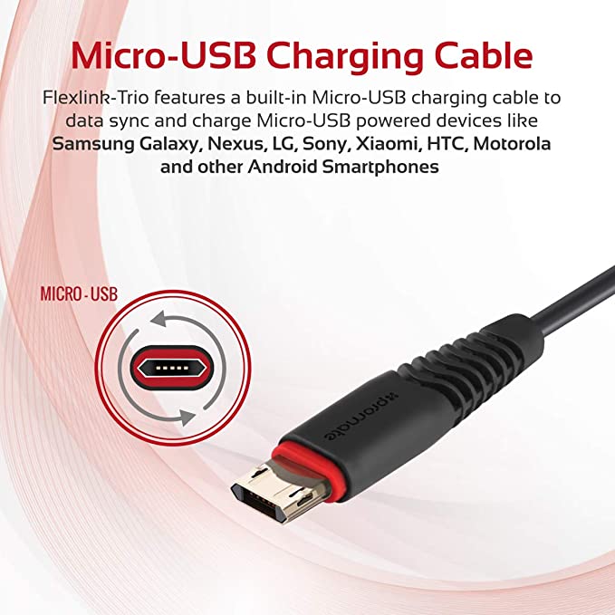 Flexlink-Trio est un kit USB multifonctionnel complet pour bon nombre de vos gadgets de style de vie. Il comprend trois embouts de charge et de synchronisation différents que vous pouvez facilement échanger. Utilisez ce kit pour tous vos besoins quotidiens tels que la connexion à votre smartphone, Lightning Connector ou des appareils compatibles USB Type-C pour une charge, un transfert de données rapide, une synchronisation de fichiers et bien plus encore. Flexlink-Trio est créé de manière unique à partir d'un matériau PVC durable, favorisant un fonctionnement sûr et protégé. Avec Flexlink-Trio, vous pouvez oublier tous les câbles que vous devez transporter pour vos différents appareils. Faites confiance à Flexlink-Trio pour tout. sur le marché. Ne soyez plus jamais sans solution de charge avec ce câble de poche mais formidablement riche en fonctionnalités. Le câble de charge 3 en 1 élimine le besoin de transporter plusieurs câbles pour vos appareils mobiles. Offrant un connecteur Lightning pour votre iPhone ou iPad, un connecteur USB-C pour votre nouveau téléphone ou tablette et un connecteur Micro-USB pour vos anciens appareils mobiles, c'est le câble idéal pour tous vos besoins de charge mobile. Connecteur Micro USB : Bien que de plus en plus d'appareils adoptent la norme USB-C, un grand nombre de téléphones utilisent encore Micro USB comme connecteur - y compris le Samsung Galaxy S7, S7 Edge, J3 et J5 2017, ainsi que la plupart des téléphones de Motorola. Gamme Moto, entre autres. Le connecteur micro USB de haute qualité de ce câble est parfait pour charger ces appareils. Connecteur Lightning : tous les appareils iPhone d'Apple, de l'iPhone 5 au dernier iPhone d'Apple Comme l'iPhone X, 8, 8 Plus, utilisez la norme Lightning - un connecteur réversible avec de grandes vitesses de charge qui se trouve également être inclus avec ce câble. Connecteur USB-C : avec de plus en plus de smartphones, de tablettes et même de consoles de jeux (Nintendo Switch) utilisant la norme USB-C, le connecteur USB-C supérieur de ce câble protège ce câble et garantit que vous pourrez l'utiliser pour de nombreuses personnes, nombreux cycles de vie des appareils à venir. Ce câble est parfait pour une utilisation avec des appareils tels que le Samsung Galaxy Note 8, S8 et S8 Plus, ainsi que le LG G6, Google Pixel, HTC U11, OnePlus 5 et plus. Chargez 3 appareils en même temps : le câble robuste Promate 3 en 1 vous permet de connecter un USB-C, Lightning et un appareil Micro USB en même temps pour les charger tous simultanément - réduisant le nombre de câbles que vous devez emporter avec vous et sans avoir à prioriser un appareil par rapport à un autre. L'USB standard fonctionne avec tous les ports USB alimentés : tout ce que vous avez à faire pour charger avec ce câble est de brancher le connecteur correspondant à votre appareil, puis de connecter l'extrémité USB standard à n'importe quel port USB alimenté, y compris les ordinateurs, les chargeurs muraux USB, les concentrateurs USB. et plus. Permet la charge et la synchronisation simultanées de votre appareil : ce câble de charge 3 en 1 de haute qualité vous permet de connecter votre appareil Lightning, Type-C ou Micro USB à votre ordinateur portable/ordinateur afin de charger votre téléphone et d'échanger/synchroniser des données simultanément. . Design durable : conçu pour résister à l'extérieur, le câble robuste Promate FlexLink-Trio est extrêmement durable et dispose d'un boîtier en polycarbonate. Tandis que la base de décharge de traction flexible garantit qu'elle ne se casse pas lorsqu'elle est utilisée et pliée pendant de longues périodes. Conception de cou flexible "ExoFlex": Conçu de manière créative, le FlexLink-Trio est doté de la technologie ExoFlex. Cette technologie fournit au FlexLink-Trio un col flexible qui assure une durée de vie de plus de 4000 plis, améliorant ainsi considérablement sa durabilité et assurant une sécurité totale. Câble portable robuste sans enchevêtrement : la conception du câble robuste mais mince rend l'utilisation du câble plus facile que jamais et le matériau robuste et résistant signifie qu'il est non seulement beaucoup moins susceptible d'être endommagé, mais il est également plus difficile à emmêler. Avec 1,2 m de long, il fonctionnera admirablement, vous donnera une distance raisonnable entre les appareils et le rendra également très portable. Glissez-le dans votre sac ou votre poche et ayez-le à portée de main lorsque vous en avez le plus besoin. La petite tête fonctionne avec la plupart des coques : le câble Lightning ultra-compact est non seulement assez petit pour s'adapter parfaitement à la plupart des coques d'appareils, mais il est également assez solide pour résister aux débranchements et stockages répétés. Protection complète avec Smart IC : permet à FlexLink-Trio de fournir un environnement de charge intelligent, sûr et efficace. En utilisant des puces intelligentes améliorées, le FlexLink-Trio identifie l'appareil et fournit un courant de charge personnalisé et précis, la vitesse de charge est augmentée de 35 %. Il protège également vos appareils contre les surcharges et les courts-circuits. On n'est jamais trop prudent avec ses précieux gadgets. Longueur de 1,2 m - Idéal pour la plupart des situations : la longueur de 1,2 m de ce câble garantit qu'il n'est pas trop long pour gêner ou faire trébucher, mais pas si court que vous ne pourrez pas utiliser votre appareil pendant le chargement. Le câble USB FlexLink-Trio peut atteindre la distance parfaite tout en étant suffisamment compact pour être jeté dans un sac et partir. Largement compatible avec les appareils : largement applicable dans l'interface IP, la micro-interface et l'interface de type C de la plupart des équipements. Compatibilité avec iPhone X, iPhone 8/8Plus, iPhone 7/7Plus, Samsung Note 8, Samsung Galaxy S8/S8 Plu