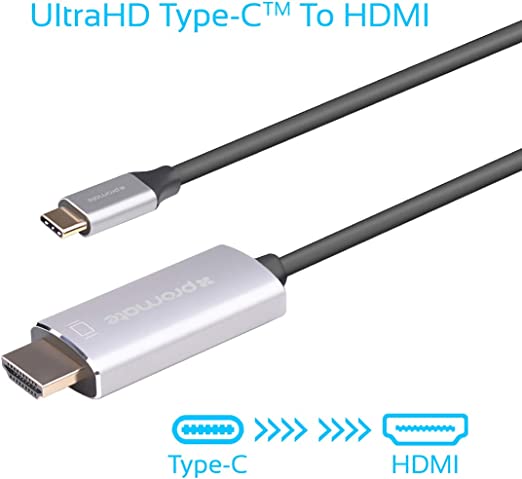 ce câble haut de gamme de Promate vous permet de mettre en miroir vos ordinateurs compatibles USB-C ou l'affichage d'un autre appareil sur votre téléviseur compatible HDMI ou d'afficher une résolution vidéo jusqu'à 4K. Il produit également du contenu vidéo comme des films et des vidéos capturées. Connectez simplement une extrémité du câble au port USB-C de votre appareil, puis une autre à votre téléviseur ou projecteur pour commencer à voir ce qui se passe sur votre ordinateur... mais cette fois sur grand écran.