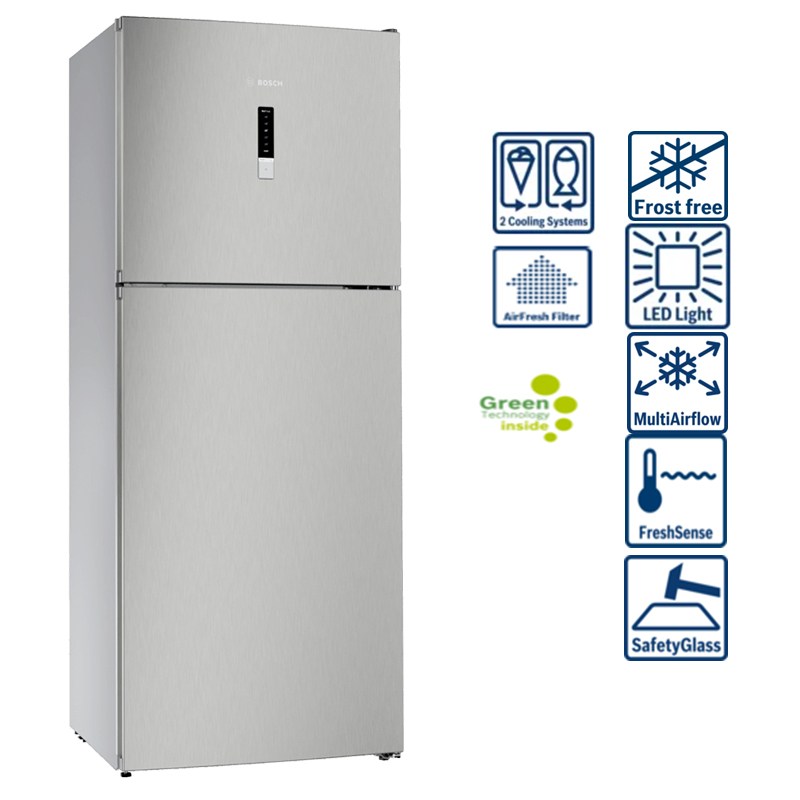 Réfrigérateur Bosch 430L Série 4 inox Anti-Traces - CAPACITÉ : 430LT - TYPE DE FROID : Multi Air Flow - CLASSE ENERGETIQUE : A+ - CLASSE CLIMATIQUE : SN-T NIVEAU De BRUIT : 42 dB(A) Taille XL : offre un large espace pour vos aliments TWIN COOLING : Deux circuits de refroidissement séparés pour un refroidissement plus rapide et aucun transfert d'odeur Fresh Sense : conditions de conservation idéales Éclairage LED : vos aliments sont toujours sous les feux de la rampe Avec afficheur - POID : 72 KG - DIMENSION ( HxLxP): 175 cm x 70cm x 60 cm - COULEUR : INOX 1