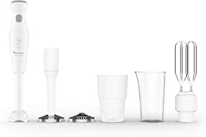 Ce pied mixeur multi-usages, d'une puissance de 450 Watts est équipé d'un pied démontable par bouton de déverrouillage. Accessoires : Grâce à ses accessoires, préparez des recettes variées ! - pied mixeur turbo : permet de réaliser des soupes onctueuses puisqu'il mixe les aliments au plus fin. - pied presse purée double grille: une grille à petits trous pour préparer des purées lisses et une grille à gros trous pour de délicieuxécrasés. - batteur double fouet : idéal pour réussir toutes les émulsions du premier coup, blancs en neige, crème chantilly, mayonnaise.... - filtre à coulis : parfait pour épater vos proches avec de succulents coulis de fruits ou de légumes. Un gobelet mesureur d'une capacité 1000 ml est fourni. Gardez vos accessoires toujours à portée de main puisqu'un coffret de rangement est livré avec l'appareil. Pratique :Vous apprécierez sa forme ergonomique pour un plus grand confort d'utilisation.Tous les accessoires sont compatibles lave-vaisselle.