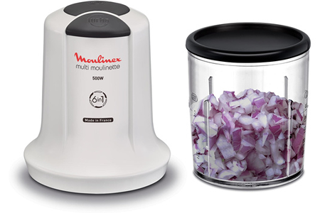 Le mini hachoir Multimoulinette 6 en 1 de Moulinex est l'appareil indispensable au quotidien ! Equipé de 4 lames spécifiques et d'un disque émulsionneur, il est parfait pour hacher, mixer, ciseler, concasser et émulsionner toutes sortes de préparations. Capacité : Son bol grande capacité vous permet de réaliser des préparations jusqu'à 300 g ou 500 ml en une seule fois. Les accessoires se rangent directement dans le bol et la multimoulinette 6 en 1 est dotée d'un système range cordon Foncitons : La Multimoulinette vous permet de : - hacher et mixer finement les fines herbes, la viande, les oignons, les noix, les légumes grâce à sa double lame lisse pour les ingrédients délicats - émulsionner rapidement pour réaliser des smoothies, soupes, sauces, purée de légumes, coulis... grâce à son son disque émulsionneur. - Double lame crantée pour les ingrédients résistants comme les grains de café, les noix ou les épices. Permet également de faire de la glace pilée Puissance et vitesses : D'une puissance de 500 Watts, il possède 2 vitesses pour mixer tous les types d'ingrédients pour un résultat parfait et adapté à chaque préparation. Base 2 en 1 : La base antidérapante se transforme en couvercle pour conserver les aliments directement dans le bol. Nettoyage : Nettoyage aisé puisque le bol , l'émulsionneur, le couvercle et les lames sont compatibles lave-vaisselle.