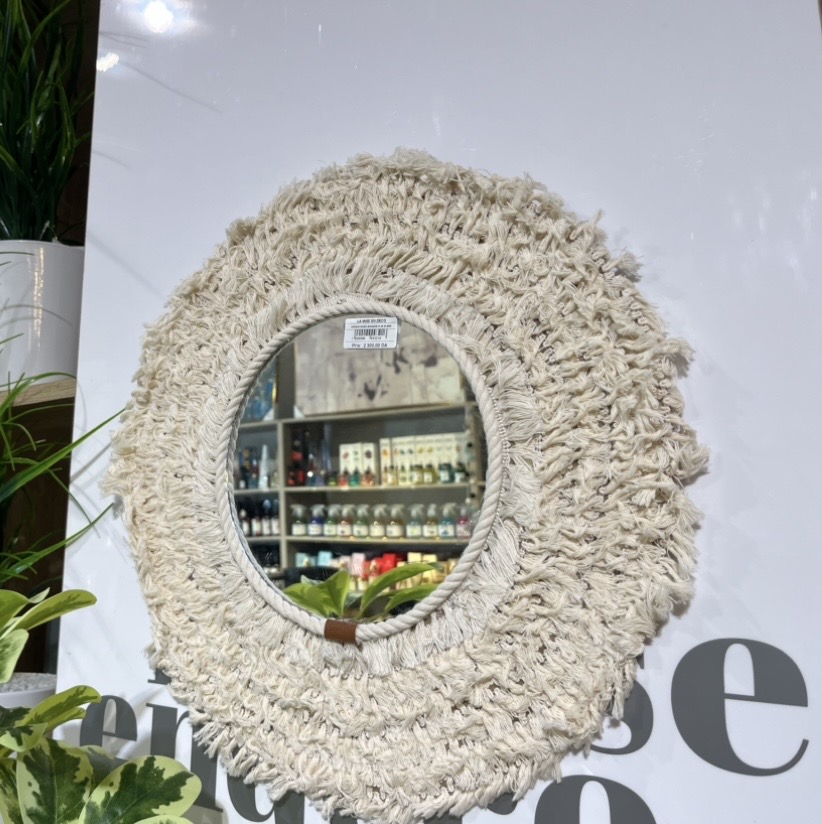 Miroir circulaire intégré dans un large cadre en macramé torsadé et effilé, donnant un effet « couronne » textile très texturé. Ce modèle apporte une touche artisanale et douce, parfait pour une décoration bohème, chambre ou salon cosy. Le cadre textile crée un jeu de volume et de lumière, tout en conservant une silh