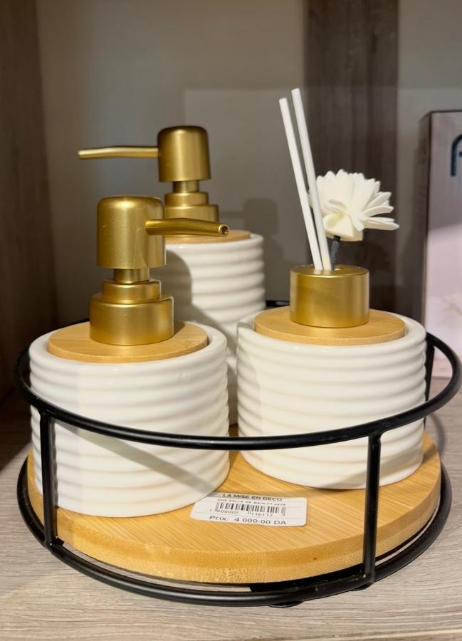 Ce set de salle de bain combine harmonieusement céramique blanche, détails en bambou et finitions dorées. Le distributeur de savon et le diffuseur créent un ensemble décoratif raffiné, parfait pour apporter une touche luxueuse et chaleureuse à votre