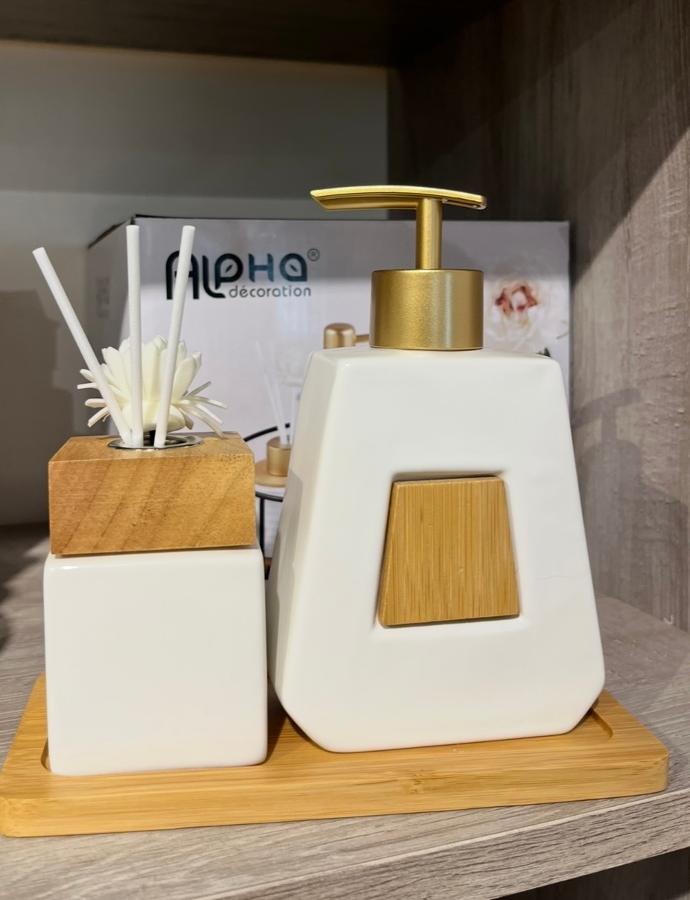 Cet ensemble élégant associe la pureté de la céramique blanche à la chaleur du bambou. Avec ses formes géométriques modernes, il apporte une touche décorative tendance à votre salle de bain. Idéal pour les espaces minimalistes et bien