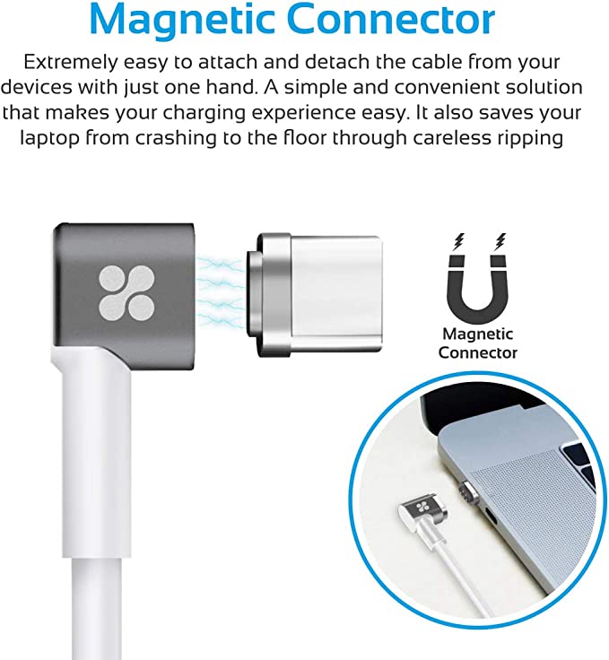 Câble de chargement magnétique USB-C vers USB-C avec alimentation électrique Plongez dans la nouvelle technologie avec MagLink-C. Découvrez la plate-forme de connectivité la plus évoluée avec MagLink-C en chargeant votre appareil à la vitesse de l'éclair avec ce câble magnétique de classe à part. MagLink-C peut fournir une puissance élevée allant jusqu'à 86 watts dans les deux sens. Compatibilité standard complète La configuration standard du MagLink-C facilite son utilisation au quotidien sans avoir à se soucier des problèmes de compatibilité ou d'utilisation sur toute la ligne. Le câble multi-usages avec charge rapide MagLink-C offre à la fois une fonctionnalité de synchronisation et de charge pour tous vos appareils, et il dispose de Power Delivery 3.0 pour une efficacité maximale. Conçu pour la convivialité et la longévité, MagLink-C utilise une conception de câble à angle droit qui le protège contre la casse et aide à la gestion des câbles en même temps. Loquet magnétique innovant et pratique. Le loquet magnétique intégré distingue le MagLink-C de ses concurrents en offrant un moyen rapide et facile de le détacher des ports USB qui est également sûr et pratique. Doté de fonctionnalités de sécurité Vous pouvez être assuré que l'utilisation du MagLink-C est vraiment sûre et fiable en raison de son assemblage intelligent et de sa fonction de protection contre les surintensités intégrée. Longueur : 2 mètres Puissance : 86 W/20,2 V, 4,3 A Appareils entièrement compatibles : - Galaxy S8/S8+ - Google Pixel - Nexus 6P - Huawei Matebook - MacBook (2016)/MacBook Pro 13,3'' Appareils compatibles (vitesses de charge limitées) - Nexus 5X - MacBook Pro 15,4''
