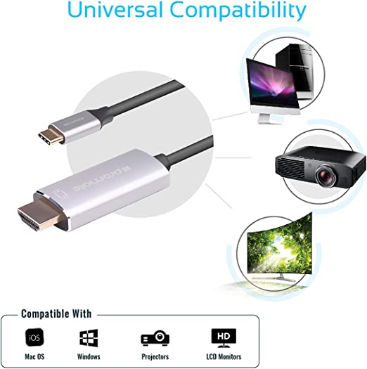 ce câble haut de gamme de Promate vous permet de mettre en miroir vos ordinateurs compatibles USB-C ou l'affichage d'un autre appareil sur votre téléviseur compatible HDMI ou d'afficher une résolution vidéo jusqu'à 4K. Il produit également du contenu vidéo comme des films et des vidéos capturées. Connectez simplement une extrémité du câble au port USB-C de votre appareil, puis une autre à votre téléviseur ou projecteur pour commencer à voir ce qui se passe sur votre ordinateur... mais cette fois sur grand écran.